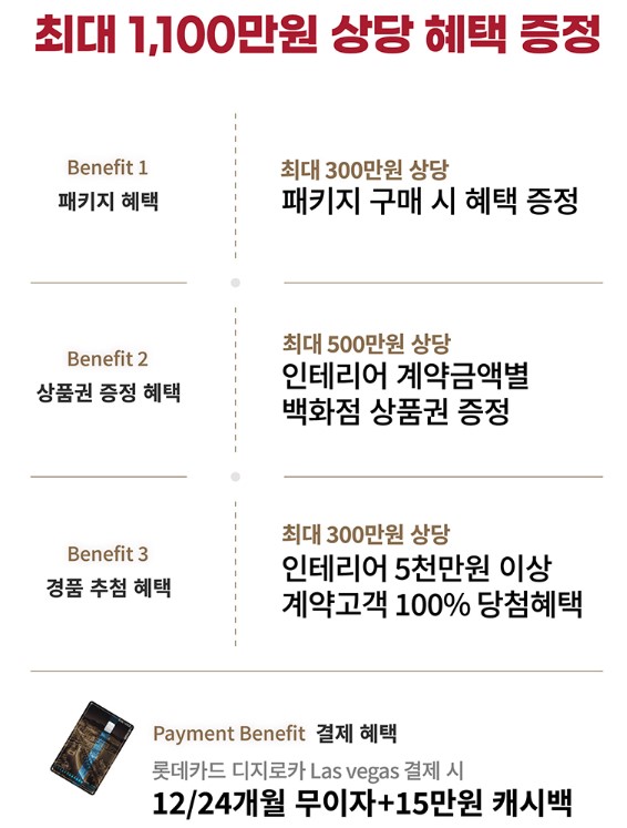 마지막으로, 풍성한 경품 추첨 이벤트도 진행된다. 5천만원 이상 계약 고객에게 고블렛 와인잔 세트를 증정하는 것을 비롯해, 추첨을 통해 애플 아이패드, LG전자 스탠바이미 TV, 하나투어 여행사 상품권 등이 제공된다.