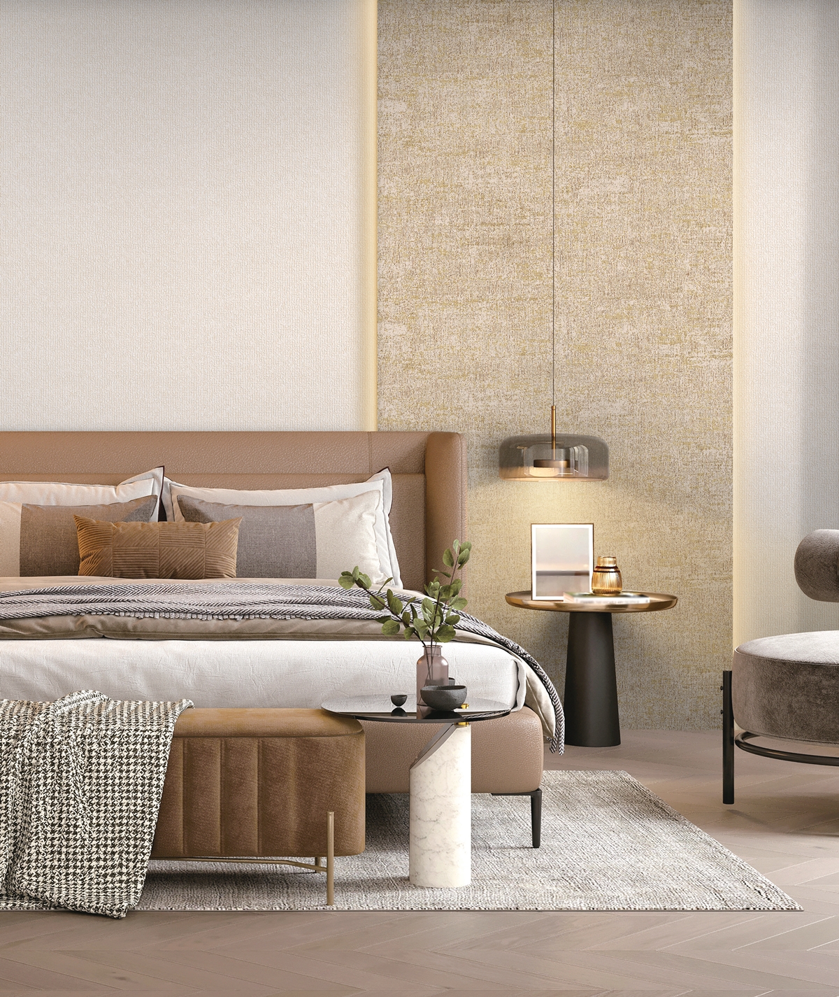 호캉스를 온 듯 차분하고 아늑한 분위기의 침실을 꾸며보고 싶다면 패브릭, 울 등 따뜻한 질감의 벽지를 선택해보세요. 울 소재의 입체감이 살아 있는 벽지와 골드 포인트 컬러를 조합하면 보다 고풍스러운 휴식 공간을 연출할 수 있습니다. 이 밖에도 테리 코튼, 스트라이프 직물, 글리터 린넨 등 클래식한 패턴 또한 우아한 느낌을 더해줍니다.