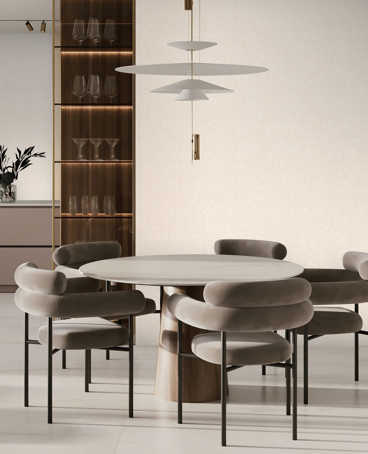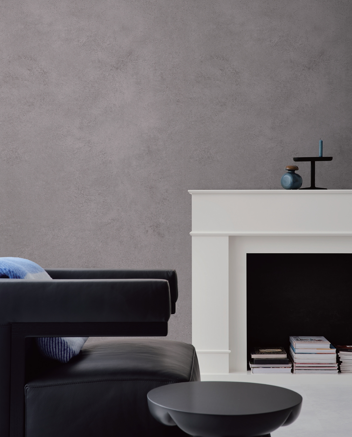 보다 시크하고 세련된 공간을 완성하고 싶다면 회벽, 스톤 등 자연 소재에서 영감을 받은 텍스처의 벽지를 활용해봐도 좋습니다. 블랙 레더, 인조대리석, 스테인리스 등 모던한 소재의 오브제나 가구와 매치하면 인테리어 효과를 더욱 극대화할 수 있어요.