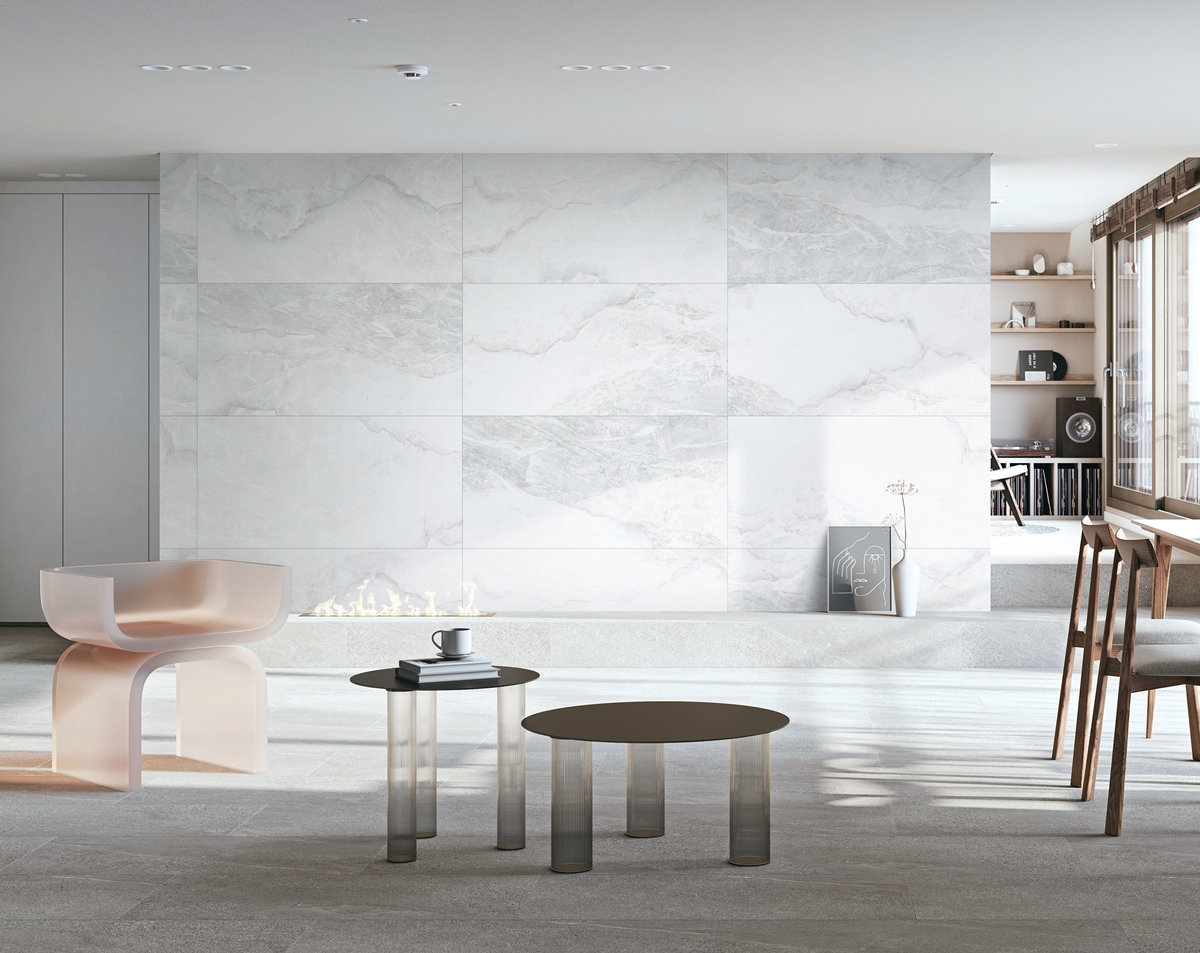 크고 선명한 베인 무늬가 개성 있는 인테리어 포인트가 되어줍니다. 이스톤 비아테라 젬마 펄, 피에트라 그레이
